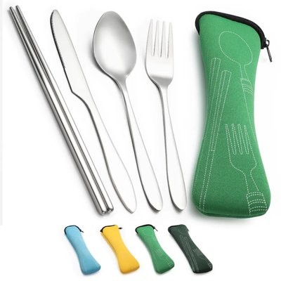 Elevate Your On-the-go Dining Experience with This Travel Cutlery Set! Enclosed in an 8 Inch x 2 1 & 2 Inch x 1 1 & 4 Inch Neoprene Zip Pouch, This Set Includes a Spoon, Fork, Knife, & Chopsticks Set, All Made From Dishwasher-safe Stainless Steel Metal. Crafted with 304 Astm Standard Food-grade Stainless Steel Metal, This Cutlery Set Boasts Thickness for Enhanced Durability. Weighing Only 93g (3.82 Oz), Its Lightweight & Convenient for Travel. the Washable Neoprene Zipper Pouch Ensures Easy Portability. Personalize It with Your Company Name or Logo for a Touch of Sophistication on the Go!