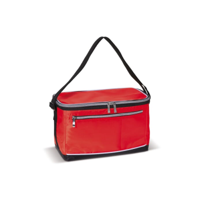 5 x 17 x 19 Cm in Red. Polyester Cool Bag with Adjustable Handle (1200X30mm). One Big Cooler Compartment & a Small Pocket on the Front. Both with Zipper Closure. Minimum Quantities Apply.