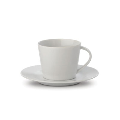 Cup & Saucer of High-Quality Porcelain. Modern Design & a Conical Shape. Espresso Model. Made in Europe. This Model Fits Well with the Mug Nice. Minimum Quantities Apply.