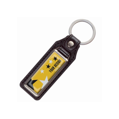 a Metal Rectangular Keyring with a Single Sided Doming on Leather Tag. Minimum Quantities Apply.