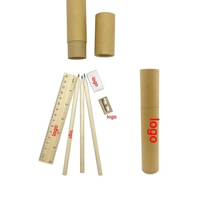This Handy Kit Features Wood Stationery. Three Pencil Set, an Eraser, a Ruler & a Pencil Sharpener.